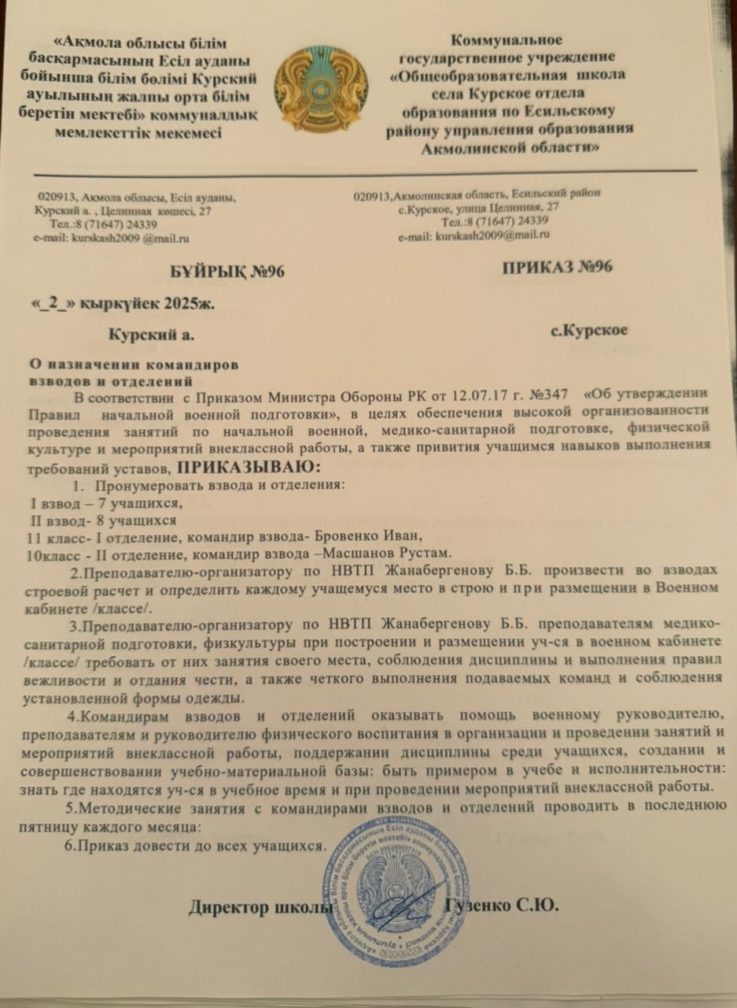 Взводтар мен бөлімшелердің командирлерін тағайындау туралы бұйрық