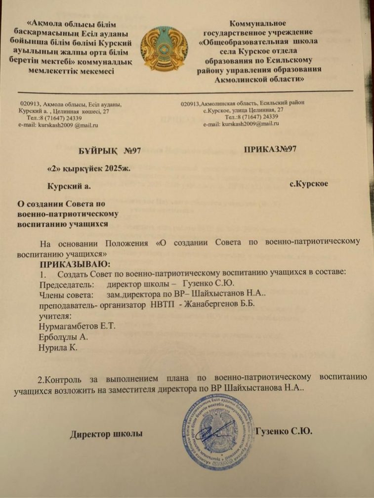 Оқушыларды әскери-патриоттық тәрбиелеу жөніндегі кеңес құру туралы бұйрық